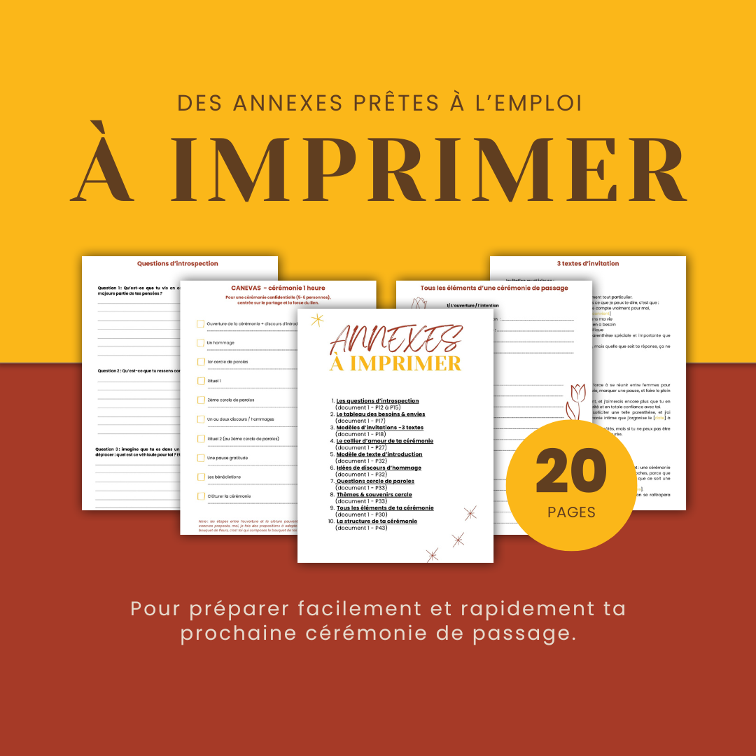 - de nombreuses idées et des supports clairs et pratiques pour que tu n’aies qu’à choisir, adapter, t’inspirer, et enfin vivre ta première cérémonie de passage.
